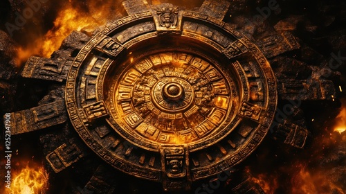 Fototapeta premium Ancient golden wheel artifact in fiery explosion