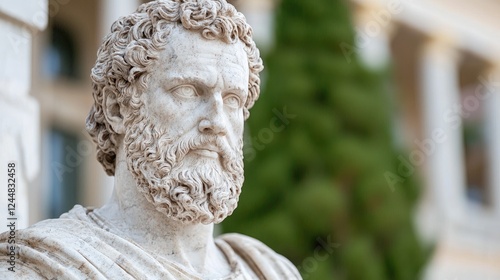 © BROPRADANA, Obraz premium Ancient Greek bust, historical building backdrop