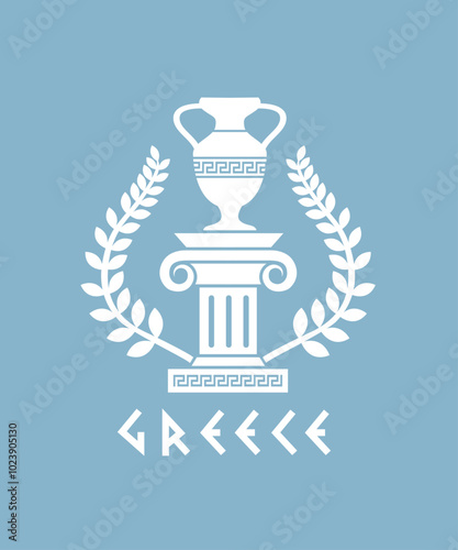 © Alexkava, Naklejka premium ancient greek symbol with column, amphora and laurel isolated on blue background