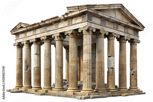 Naklejka premium Ancient Greek temple facade with Ionic columns and pediment isolated on a...