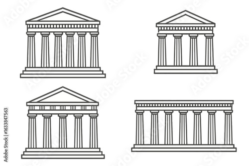 Obraz premium Ancient Greek Temples Vector Set. Classical Architecture Illustration Collection. Outline Parthenon Icon, Corinthian, Ionic, Doric Columns. Historic Landmarks, Museum Facade. Editable Clipart