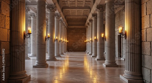 Naklejka premium Ancient Hallway with Marble Columns and Candlelight