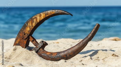 Fototapeta premium Ancient harpoon resting on sandy beach, partially buried with weathered...