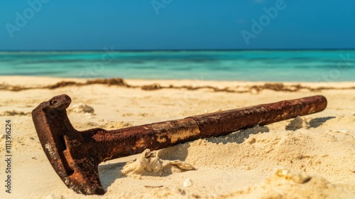 Fototapeta premium Ancient harpoon resting on sandy beach, partially buried with weathered...