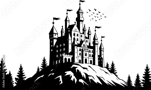 © Grafica, Fototapeta premium Ancient Haunted Castle Silhouette – Vector Illustration on White Background