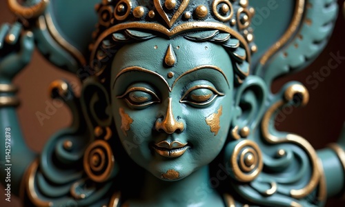 Naklejka premium Ancient Hindu deity statue intricate bronze sculpture teal