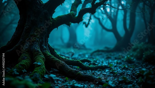 Fototapeta premium Ancient ironwood trees in a twilight forest with moss, fungi, and shimmering...