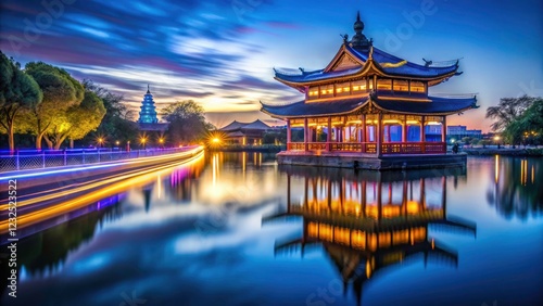 © ChannelPIC, Fototapeta premium Ancient Jiangsu's Wenchang Pavilion glows in long-exposure night photography; stunning scenic views for the travel album.
