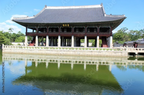 Obraz premium Ancient Korean temple with a reflective pond