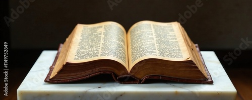 Obraz premium Ancient leather-bound bible on a white marble pedestal, relic, artifact,...