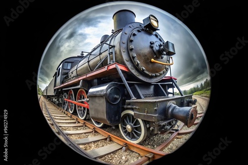 © methinee, Fototapeta premium Ancient locomotive in fisheye perspective on black background