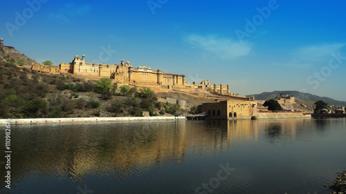 © anna_purna, Fototapeta premium Ancient magnificent Amber fort towering on a rocky hill reflecte