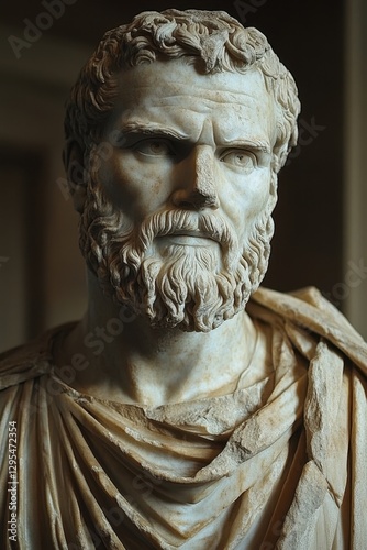 © DriftPixels, Fototapeta premium Ancient marble bust of a bearded philosopher with draped clothing in a museum setting showcasing classical art and sculpture with historical significance and artistic detail