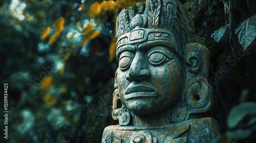 © ds17, Fototapeta premium Ancient Mayan Stone Statue Surrounded by Lush Jungle Vegetation and Sunbeams