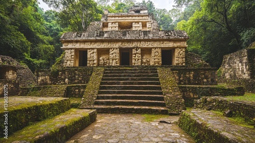 Obraz premium Ancient mayan temple in dense jungle with stone carvings and steps in...