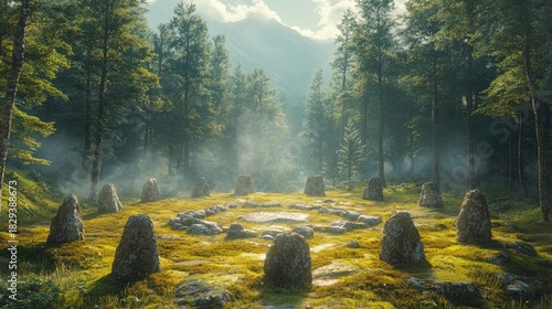© kanesuan, Fototapeta premium Ancient Megalithic Circle in Lush Forest Surrounded by Mist