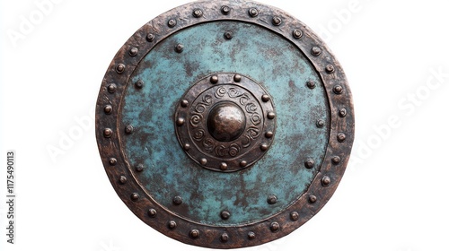 © Digital Dreamscapes, Fototapeta premium Ancient Metal Shield with Decorative Boss on White Background.
