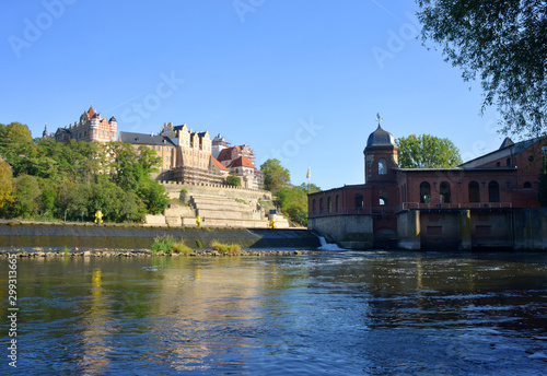 © Sinuswelle, Fototapeta premium Ancient mill with a view over the Saale river to the castle in Bernburg, Germany