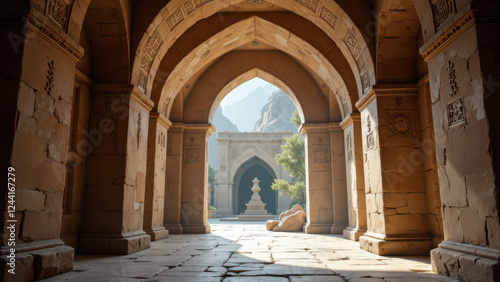 © Tameem, Naklejka premium Ancient mosque interior with sunlight streaming through arched doorways.
