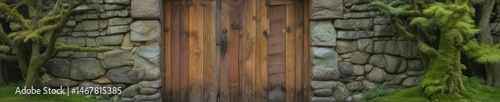 © dadtophoto, Obraz premium Ancient moss-covered stone structure, wooden door, tranquil forest , woodland, ancient