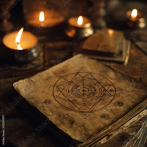 © tanawatbig, Fototapeta premium Ancient Mystical Manuscript with Esoteric Symbols and Candlelight in a Darkened Room, Evoking a Sense of Mystery and Arcane Knowledge in a Vintage Setting