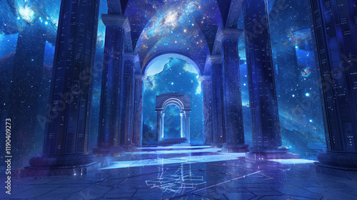 Fototapeta premium Ancient Mystical Temple Interior with Glowing Blue Portal and Magic Crystals...
