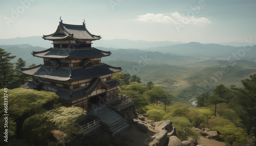 © Jemastock, Fototapeta premium Ancient pagoda atop mountain, symbolizing Chinese and Japanese cultures generated by AI