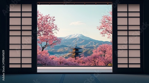 © anong, Fototapeta premium Ancient pagoda surrounded by cherry blossoms kyoto landscape photography serene environment panoramic view