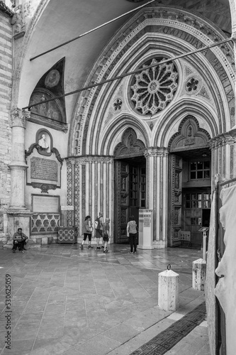 © Nicola Simeoni, Naklejka premium Ancient Papal basilica of San Francesco of Assisi. Art and religion. Black and white