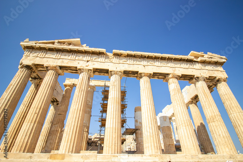 © HuseyinEren, Obraz premium Ancient Parthenon Temple on top of the Acropolis Athens, Greece at sunny day with a blue sky. The landmark of Athens. Parthenon is the temple of for dedication to the goddess Athena.