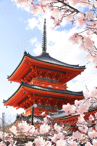 Obraz premium Ancient pavilion and blooming sakura branches in Fushimi Inari shrine. Spring...