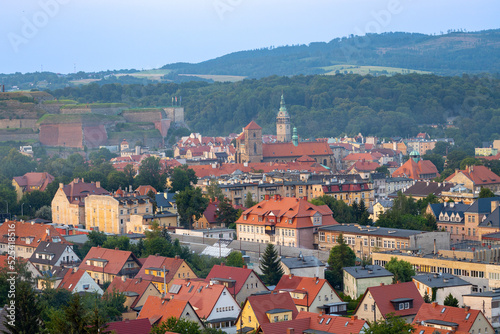 Obraz premium Ancient Polish city of Klodzko from above. View of the red tiled roofs from...