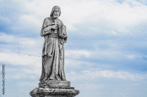 © Todayphoto, Fototapeta premium Ancient religious statue in the old cemetery on the background sky with clouds. Jesus with bible