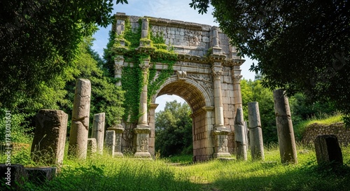 © IMOTIONart, Fototapeta premium Ancient Roman Archway Ruins Overgrown With Green Ivy Lush Foliage Sunlight Through Trees