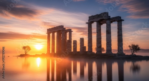 © Natalia, Fototapeta premium Ancient Ruins at Sunrise. Concept featuring ancient ruins, sunrise, columns, reflection, water.