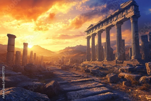 © YouraPechkin, Fototapeta premium Ancient ruins basking in sunset glow near majestic mountains