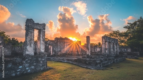 © Berkah1789, Fototapeta premium Ancient ruins stand against a vibrant sunset sky background