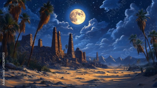© Suprapti, Naklejka premium Ancient Ruins Under a Full Moon in the Desert
