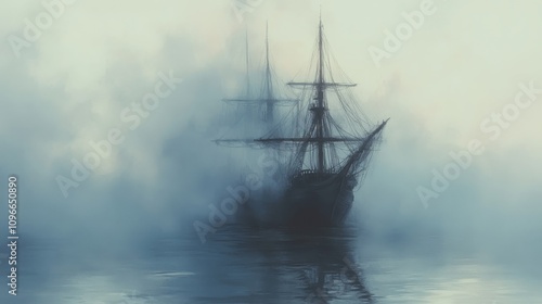 Fototapeta premium Ancient sailing ship emerges from morning mist