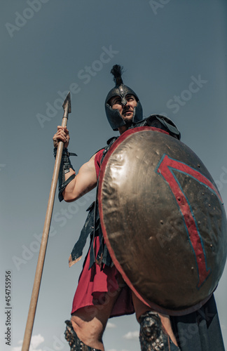 Naklejka premium Ancient Spartan warrior in battle dress stands with shield and spear.
