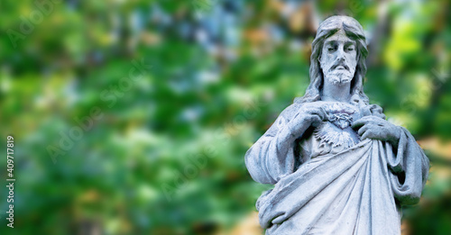 © zwiebackesser, Obraz premium Ancient statue of Jesus Christ. Free copy space for design or text.