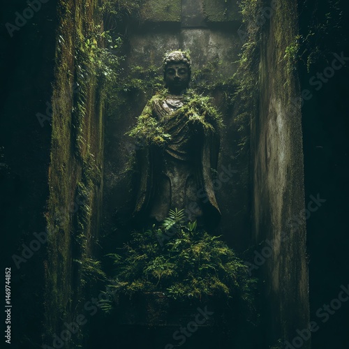 © nuttapong, Fototapeta premium Ancient statue surrounded by lush greenery.