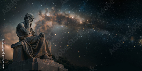 © Pierre Villecourt, Fototapeta premium Ancient Stoic Philosopher Statue Under Starry Night Sky with Milky Way