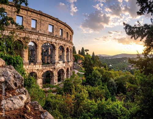 © Hayul, Fototapeta premium Ancient Stone Amphitheater at Sunset