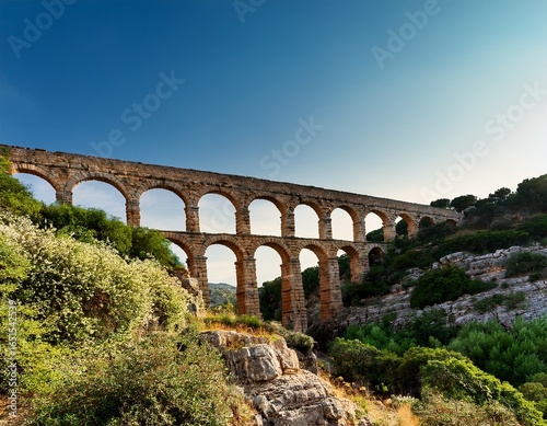 Obraz premium ancient stone aqueduct with multiple arches over rocky terrain and green foliage