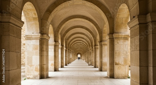 Fototapeta premium Ancient stone arcade stretches into the distance with a lone figure.