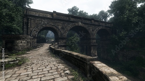 © Big9869, Fototapeta premium Ancient Stone Arch Bridge in a Misty Forest