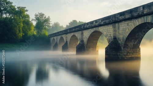 Naklejka premium Ancient stone arch bridge over a misty river at dawn. Lush greenery on the banks