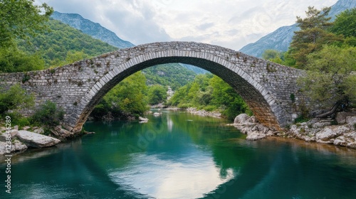 © Zaenal, Fototapeta premium Ancient Stone Arch Bridge Over Serene Green River Valley
