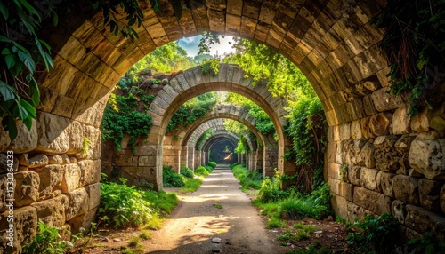 Fototapeta premium Ancient Stone Arches Covered in Greenery with Warm Sunlight Filtering Through...